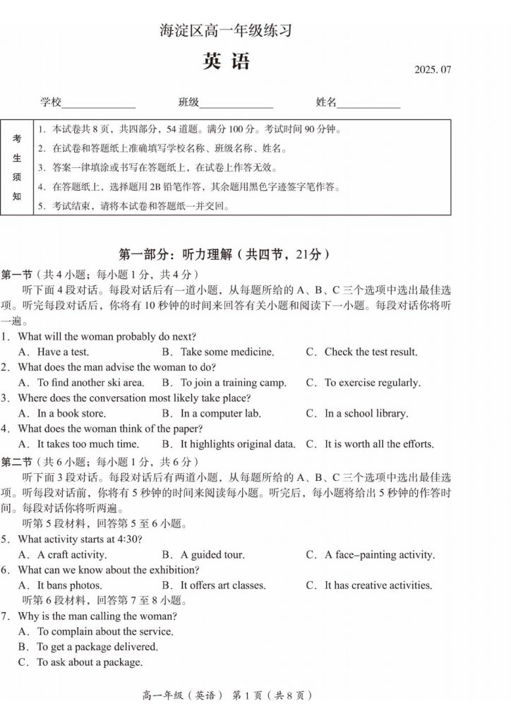 2025年北京各区高一(下)期末考已陆续开始进行,admw360教研组整理了2025北京海淀高一(下)期末英语试题及答案,分享给大家。