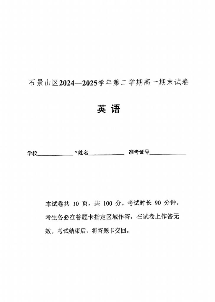 2025年北京各区高一(下)期末考已陆续开始进行,admw360教研组整理了2025北京石景山高一(下)期末英语试题及答案,分享给大家。