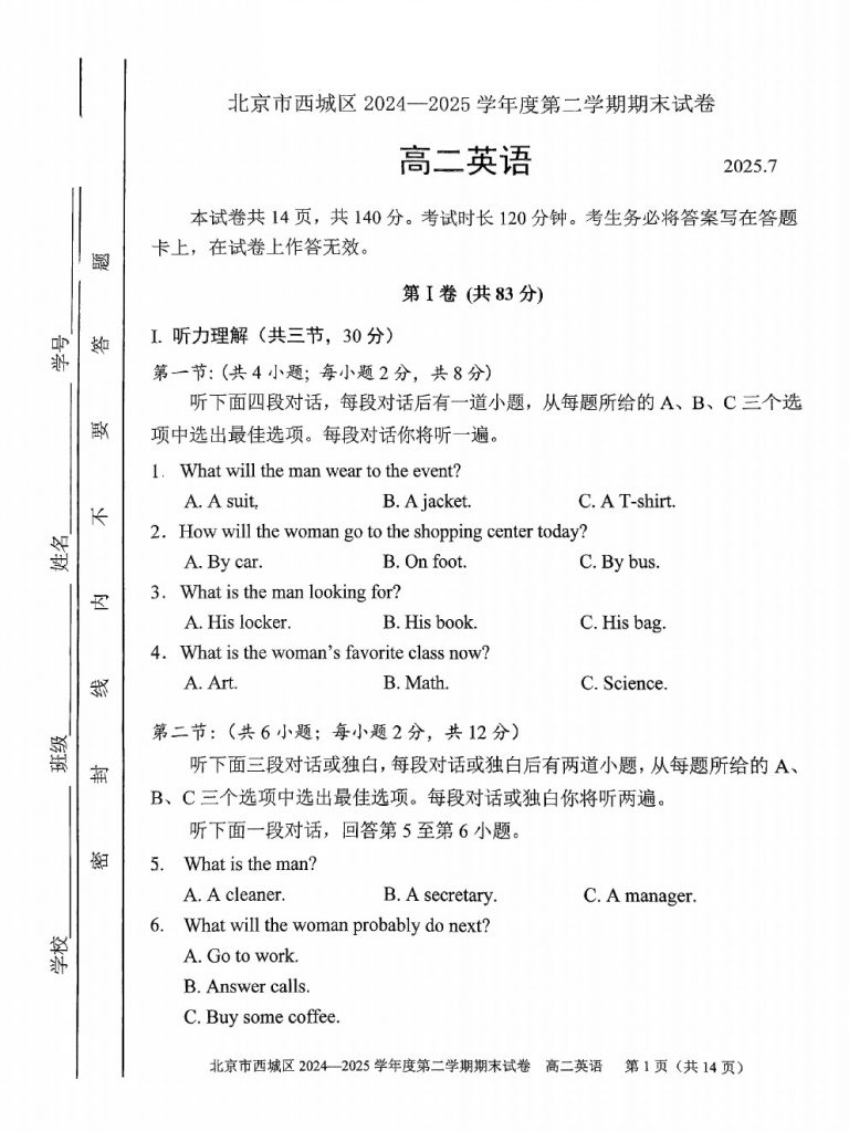 2025年北京各区高二(下)期末考已陆续开始进行,admw360教研组整理了2025北京西城高二(下)期末英语试题,分享给大家。