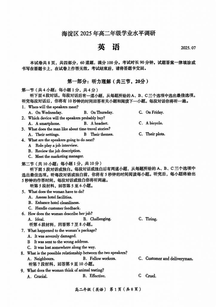 2025年北京各区高二(下)期末考已陆续开始进行,admw360教研组整理了2025北京海淀高二(下)期末英语试题及答案,分享给大家。