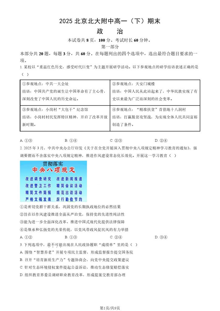 2025年北京各区高一(下)期末考已陆续开始进行,admw360教研组整理了2025北京北大附中高一(下)期末政治试题及答案,分享给大家。