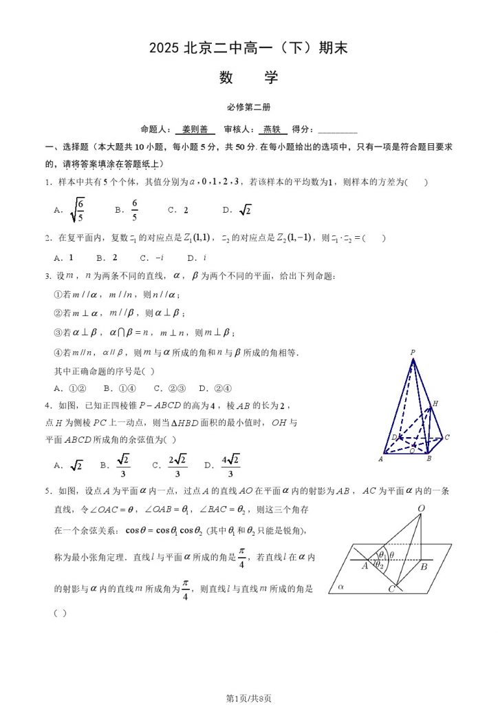 2025年北京各区高一(下)期末考已陆续开始进行,admw360教研组整理了2025北京二中高一(下)期末数学试题及答案,分享给大家。