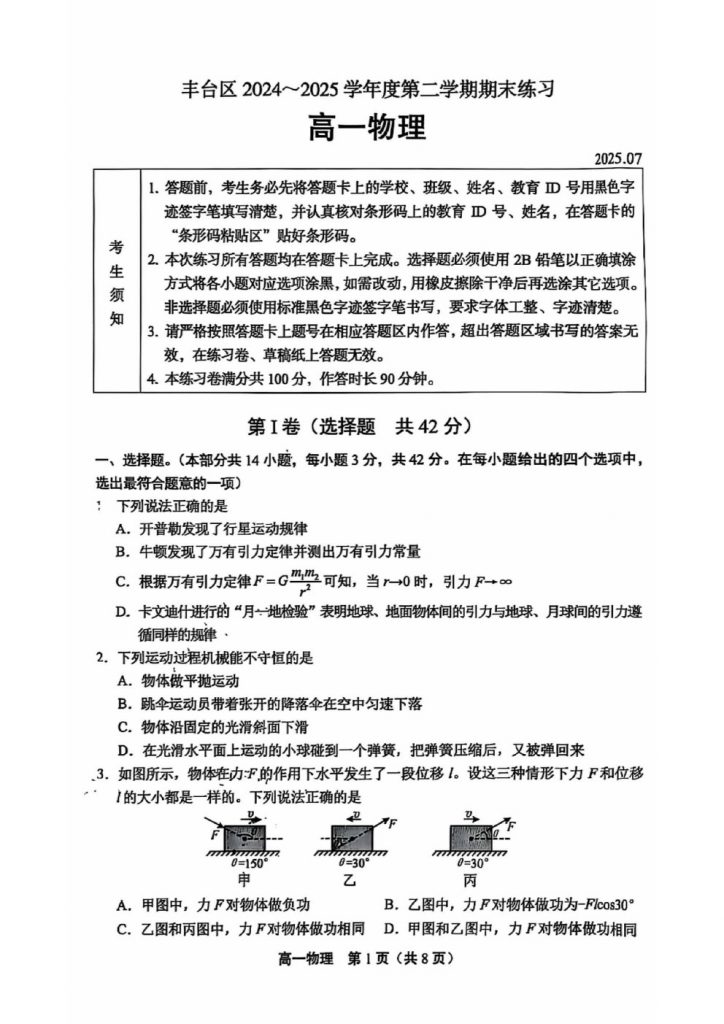 2025年北京各区高一(下)期末考已陆续开始进行,admw360教研组整理了2025北京丰台高一(下)期末物理试题,分享给大家。