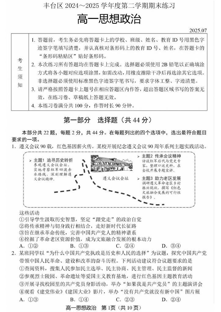 2025年北京各区高一(下)期末考已陆续开始进行,admw360教研组整理了2025北京丰台高一(下)期末政治答案,分享给大家。