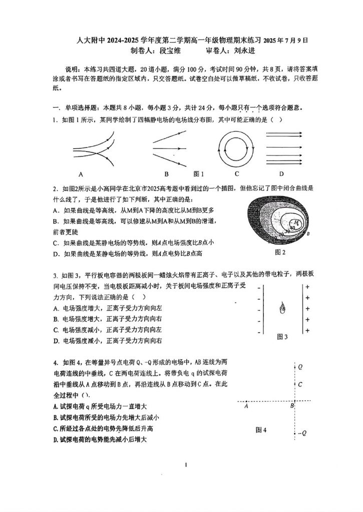 2025年北京各区高一(下)期末考已陆续开始进行,admw360教研组整理了2025北京人大附中高一(下)期末物理试题及答案,分享给大家。