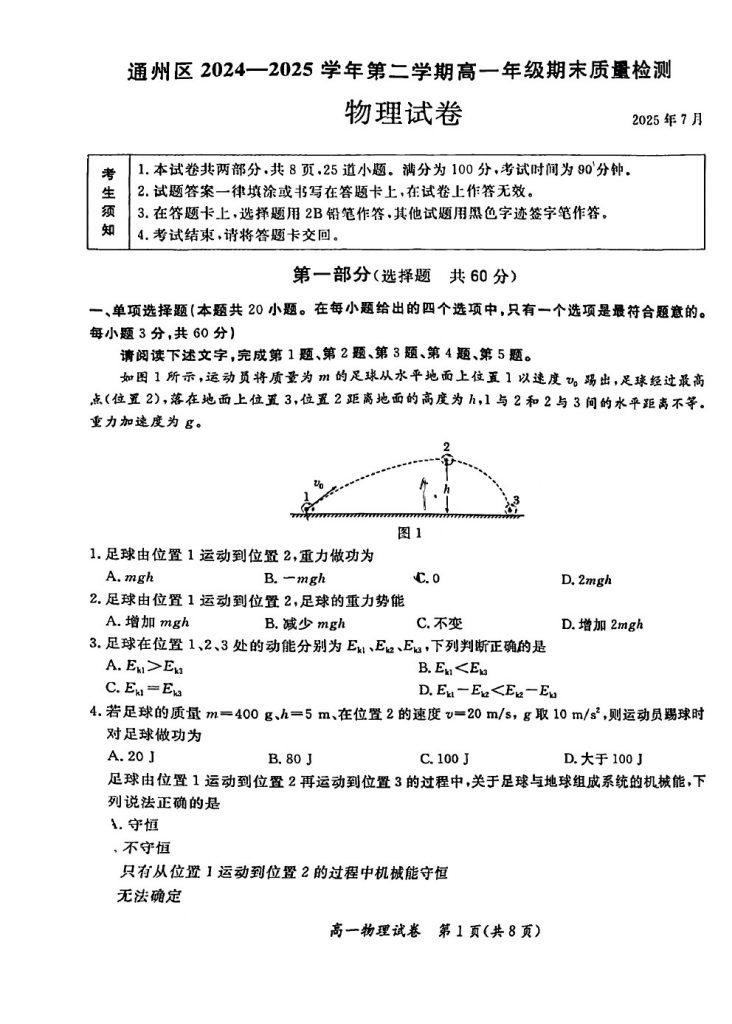2025年北京各区高一(下)期末考已陆续开始进行,admw360教研组整理了2025北京通州高一(下)期末物理试题,分享给大家。