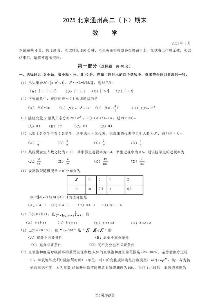 2025北京通州高二(下)期末数学试题及答案