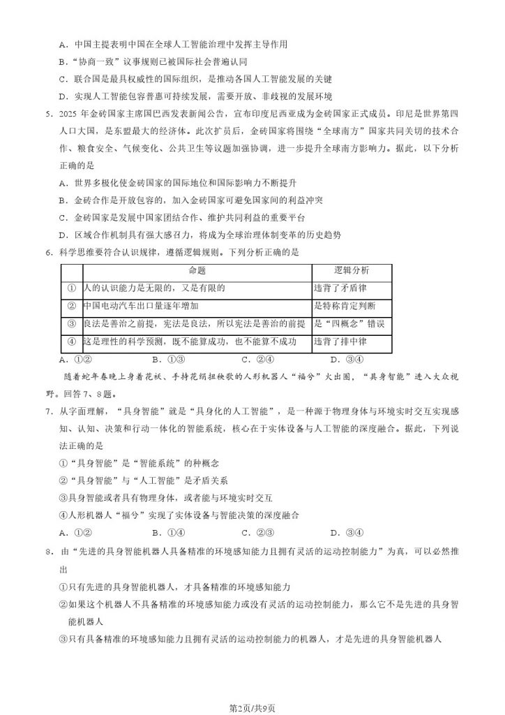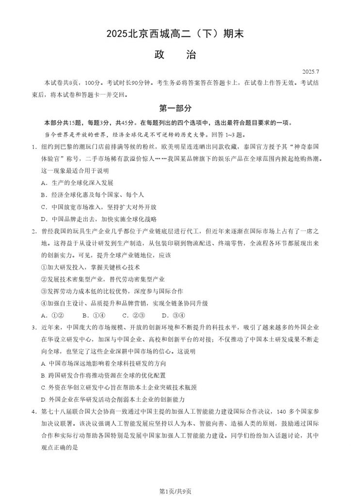 首页 高二资料 2025北京西城高二(下)期末政治试题及答案