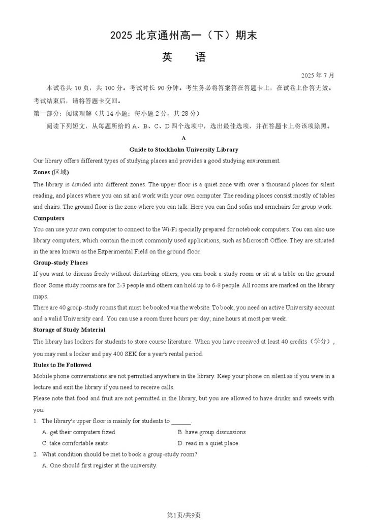 2025年北京各区高一(下)期末考已陆续开始进行,admw360教研组整理了2025北京通州高一(下)期末英语试题及答案,分享给大家。