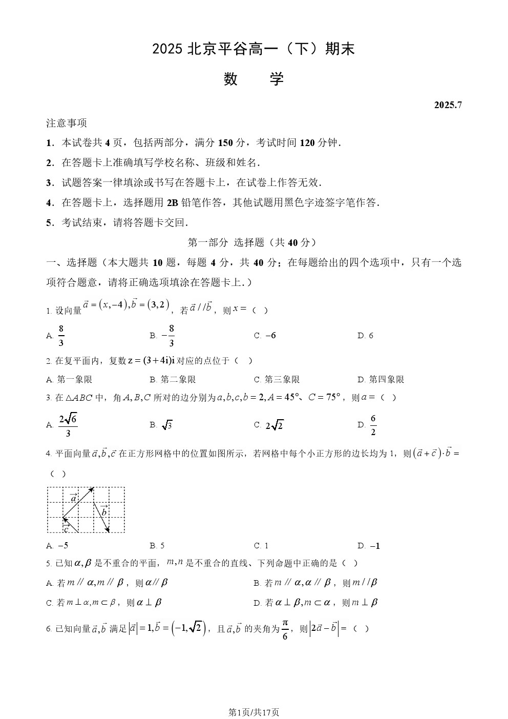 2025年北京各区高一(下)期末考已陆续开始进行,admw360教研组整理了2025北京平谷高一(下)期末数学试题及答案,分享给大家。