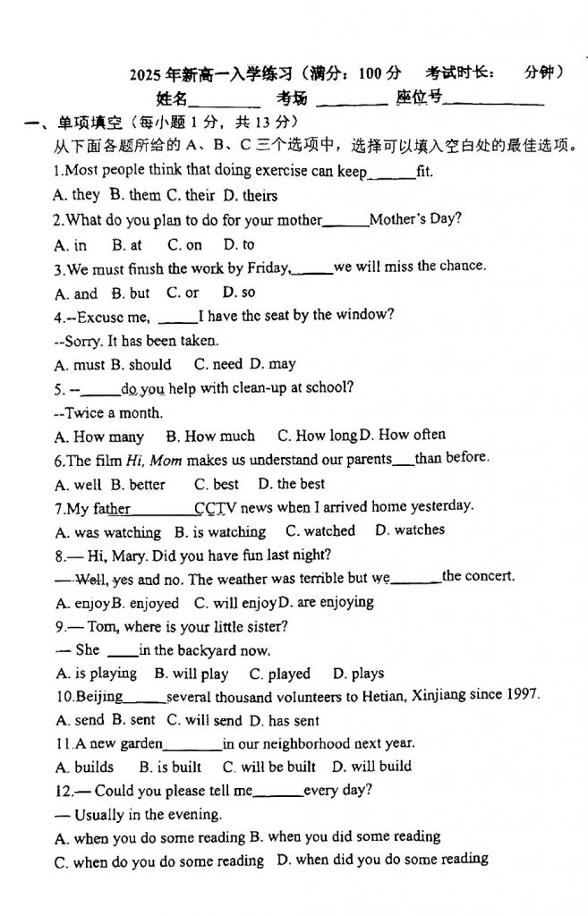 试题汇总:2025北京新高一分班考试题及答案汇总