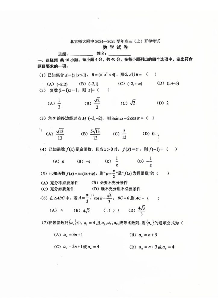 admw360教研组整理了2025北师大附中高三(上)开学考数学试题,看看都考了哪些内容?