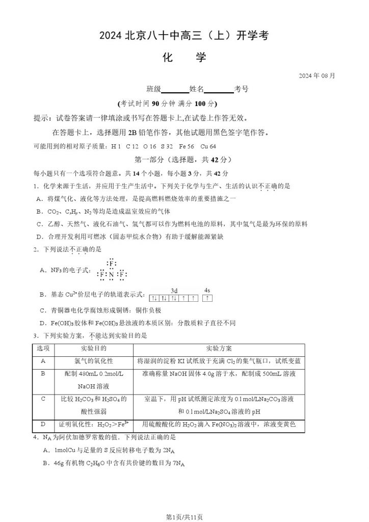 admw360教研组整理了2024北京八十中高三(上)开学考化学试题及答案,看看都考了哪些内容?