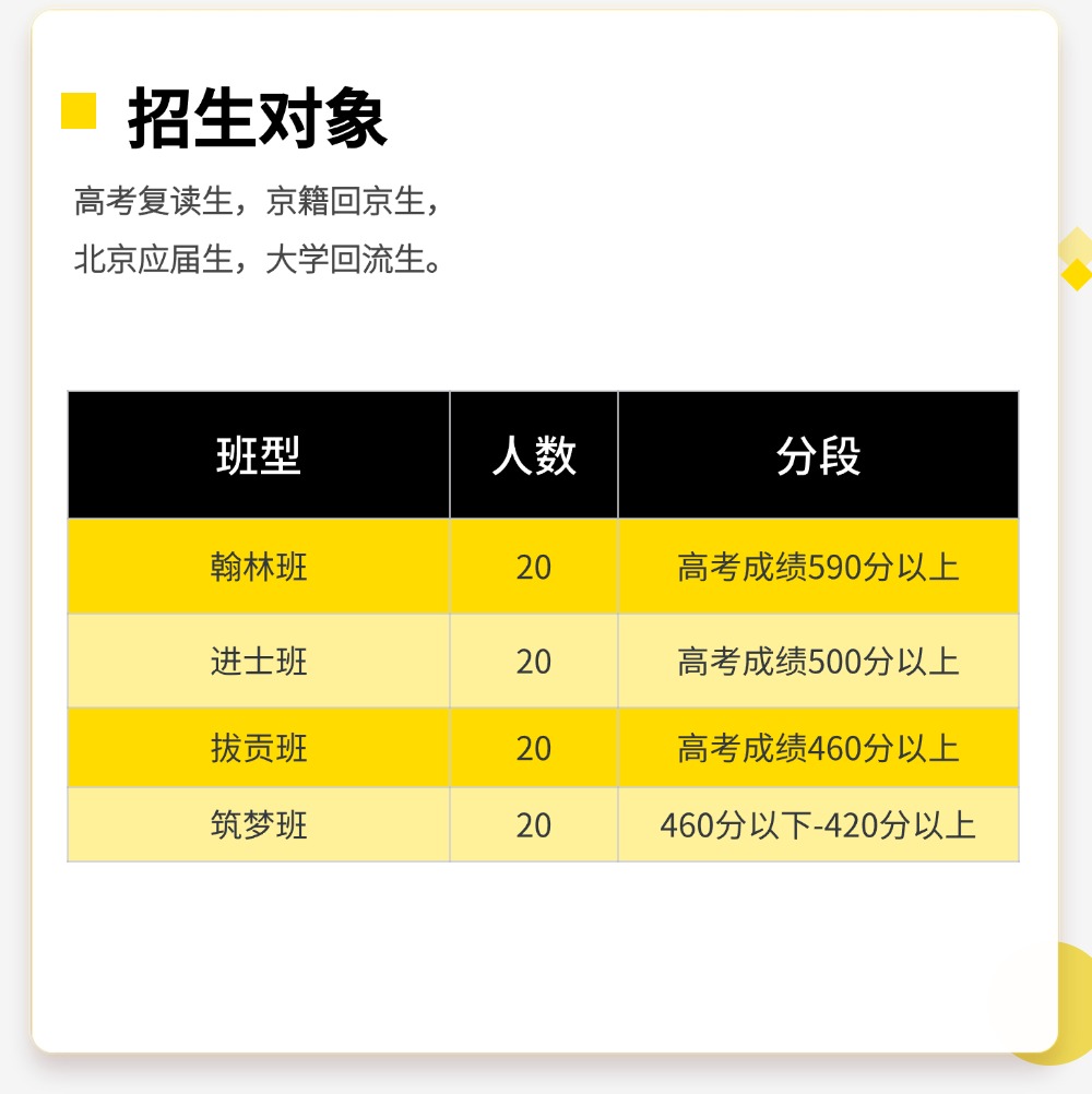 招生对象: 高考成绩未达预期,有志于通过高效复读冲击更高目标的应届/往届高中毕业生。