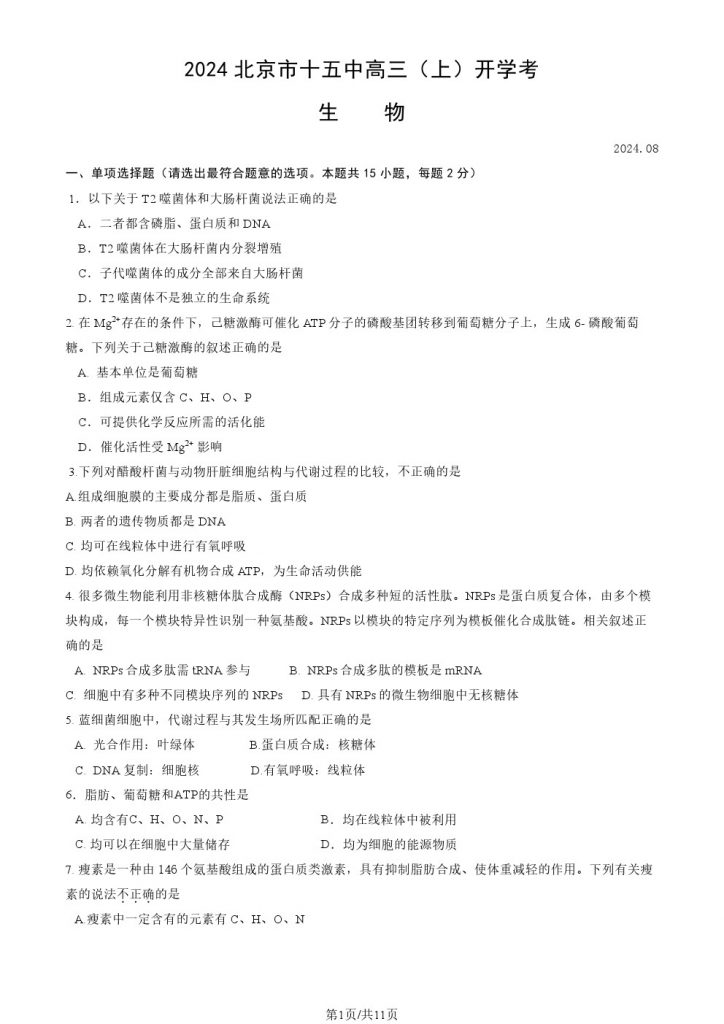 2024北京十五中高三(上)开学考生物试题及答案 //m.admw360.com/gaokao/74112.html Wed, 20 Aug 2025 01:49:50 +0000 //m.admw360.com/gaokao/?p=74112 admw360教研组整理了2024北京市十五中高三(上)开学考生物试题及答案,看看都考了哪些内容?