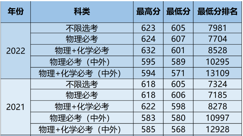 2020-2022年学校普通类专业在北京录取的最低分分别为606、597、595分,对应的录取最低分排名分别为8263、8453、9405名;中外合作办学专业录取最低分排名分别为10027、11822、12633。其他各省的录取情况,包括分专业录取情况、招生计划安排均可在北京林业大学招生网查询。