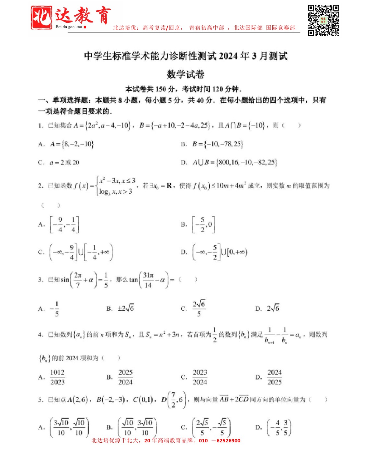 清华大学2024年3月中学生标准学术能力测试数学试卷及答案解析