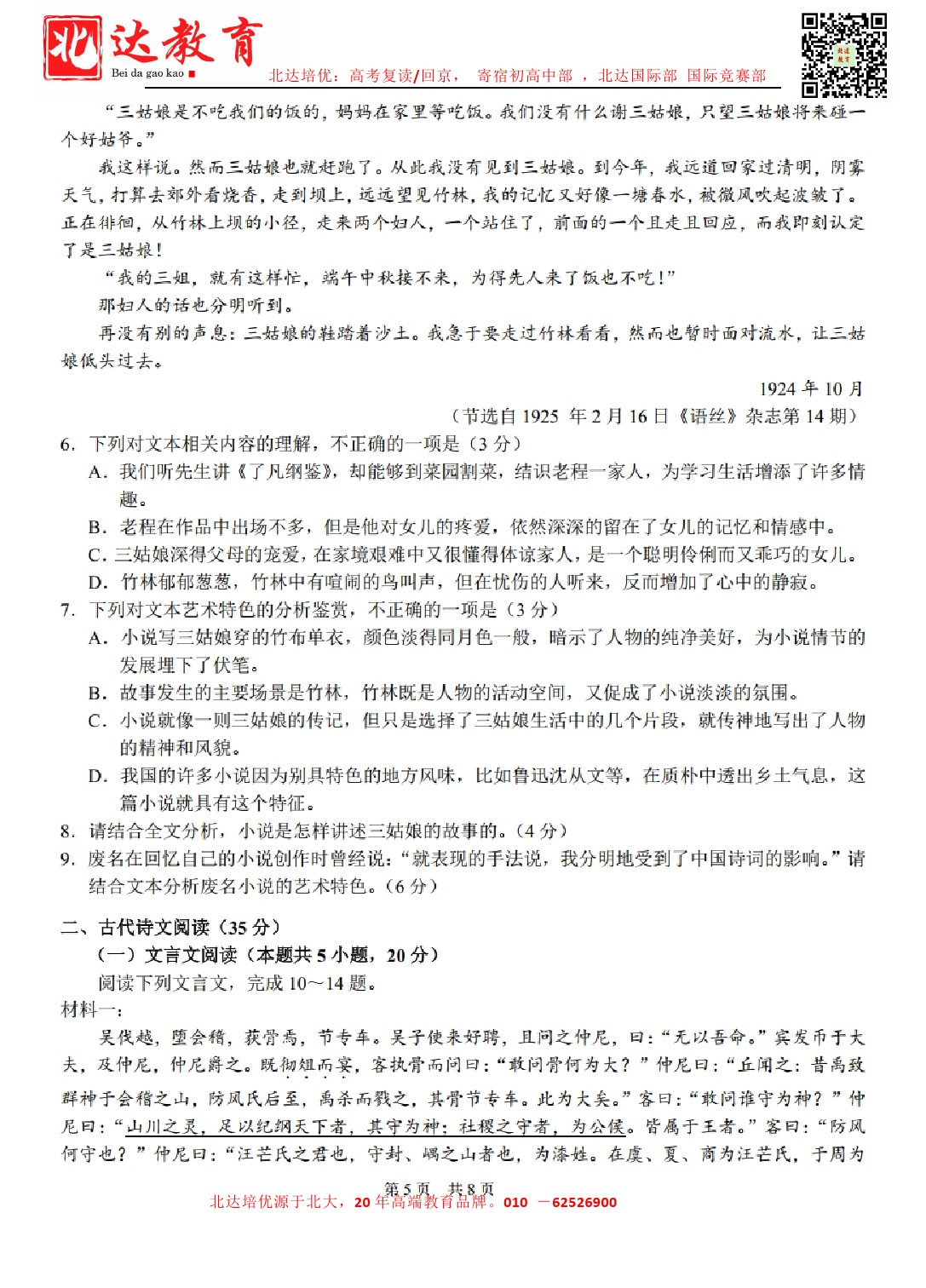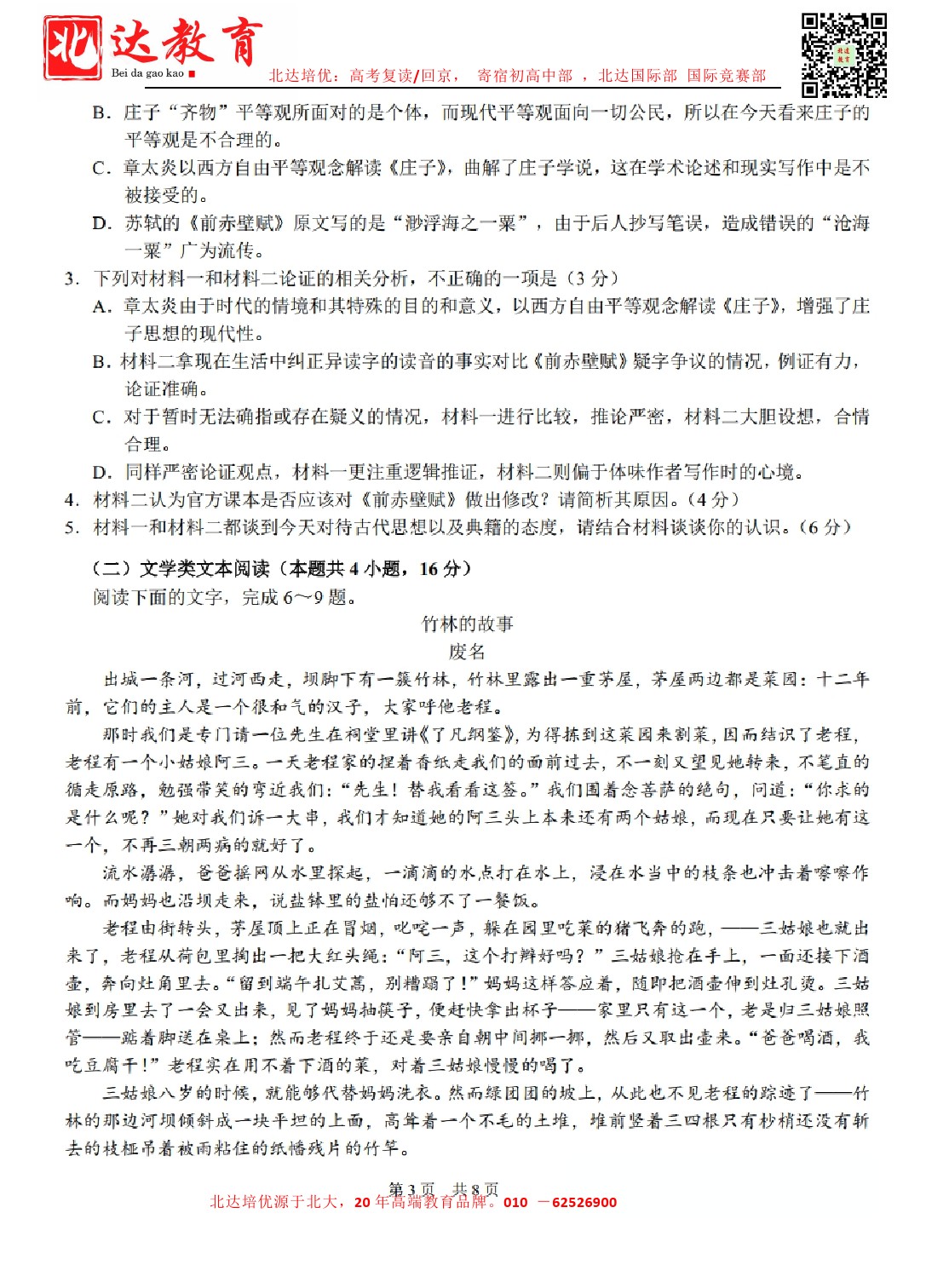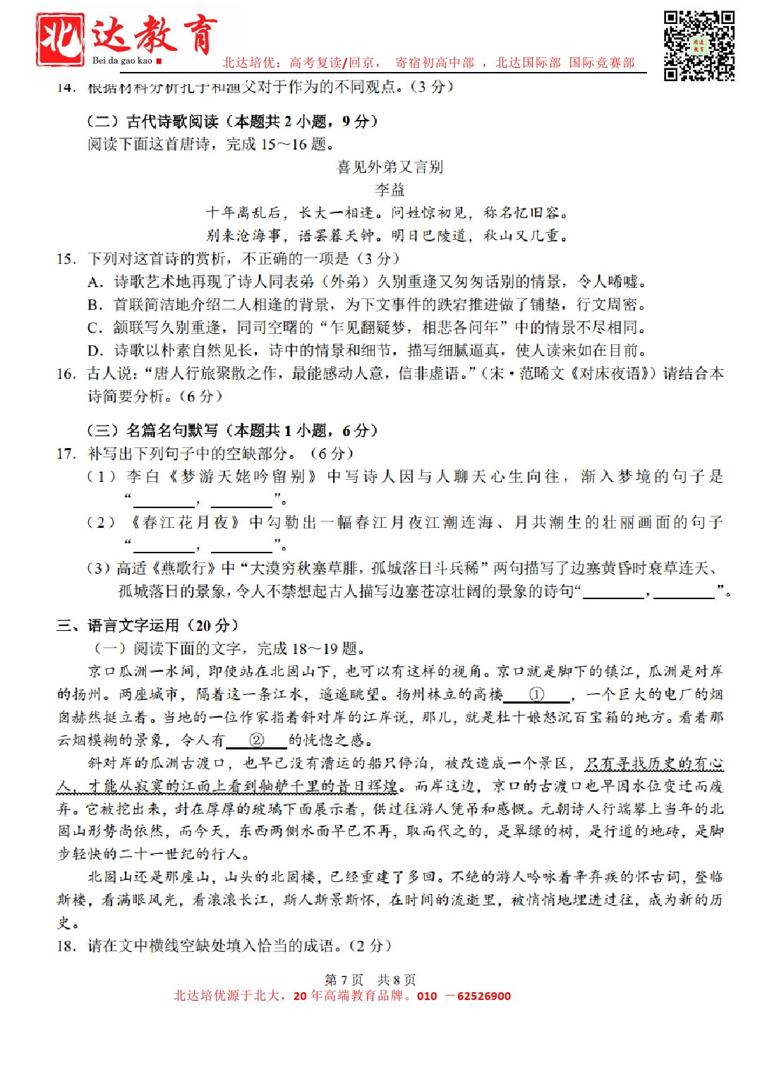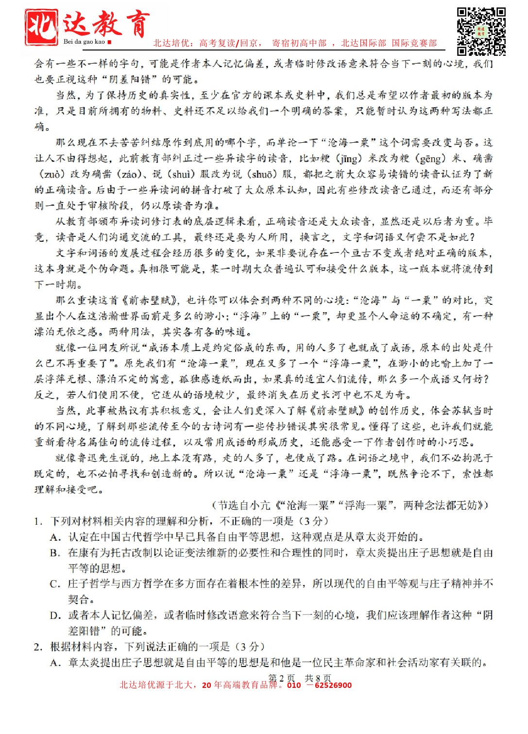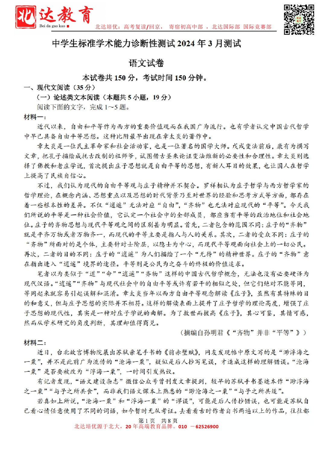 清华大学2024年3月中学生标准学术能力测试语文试卷及答案解析