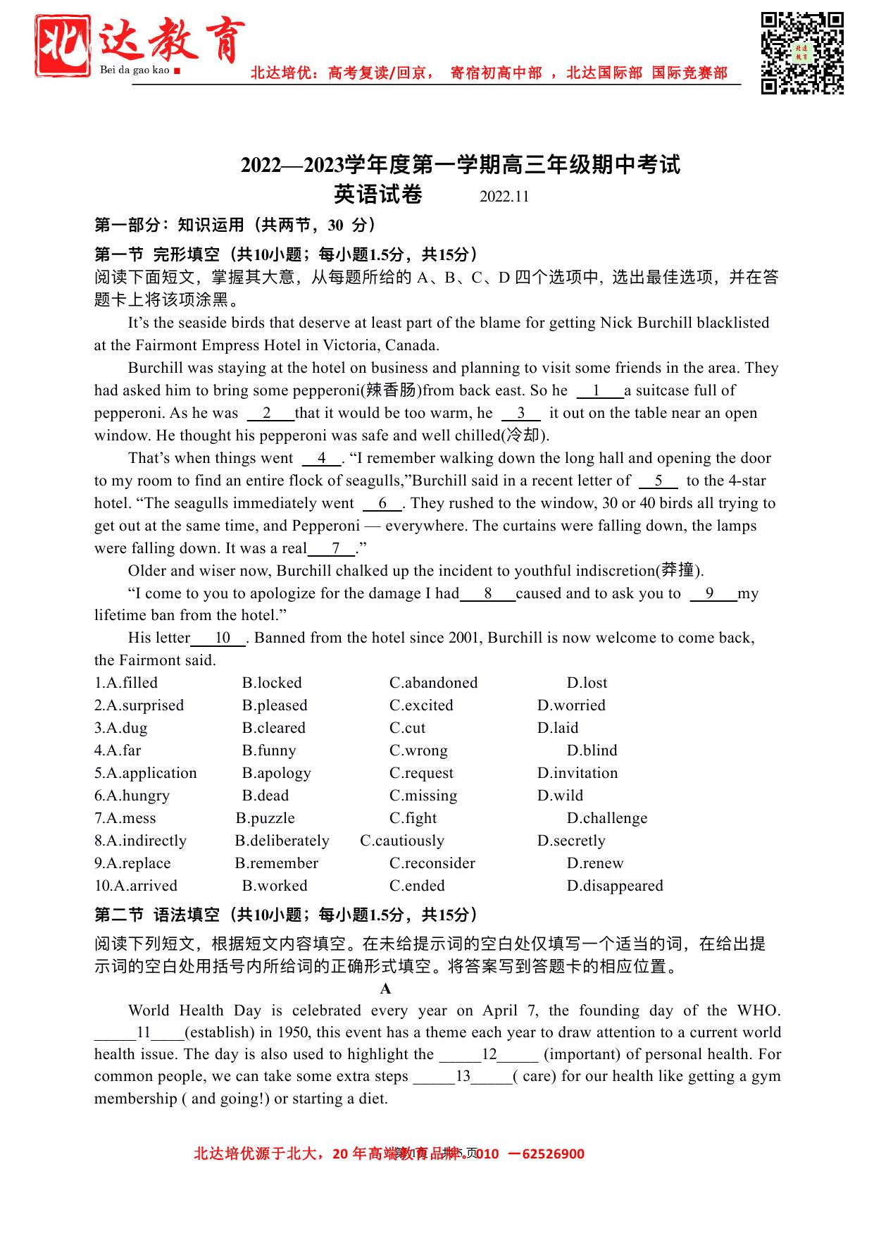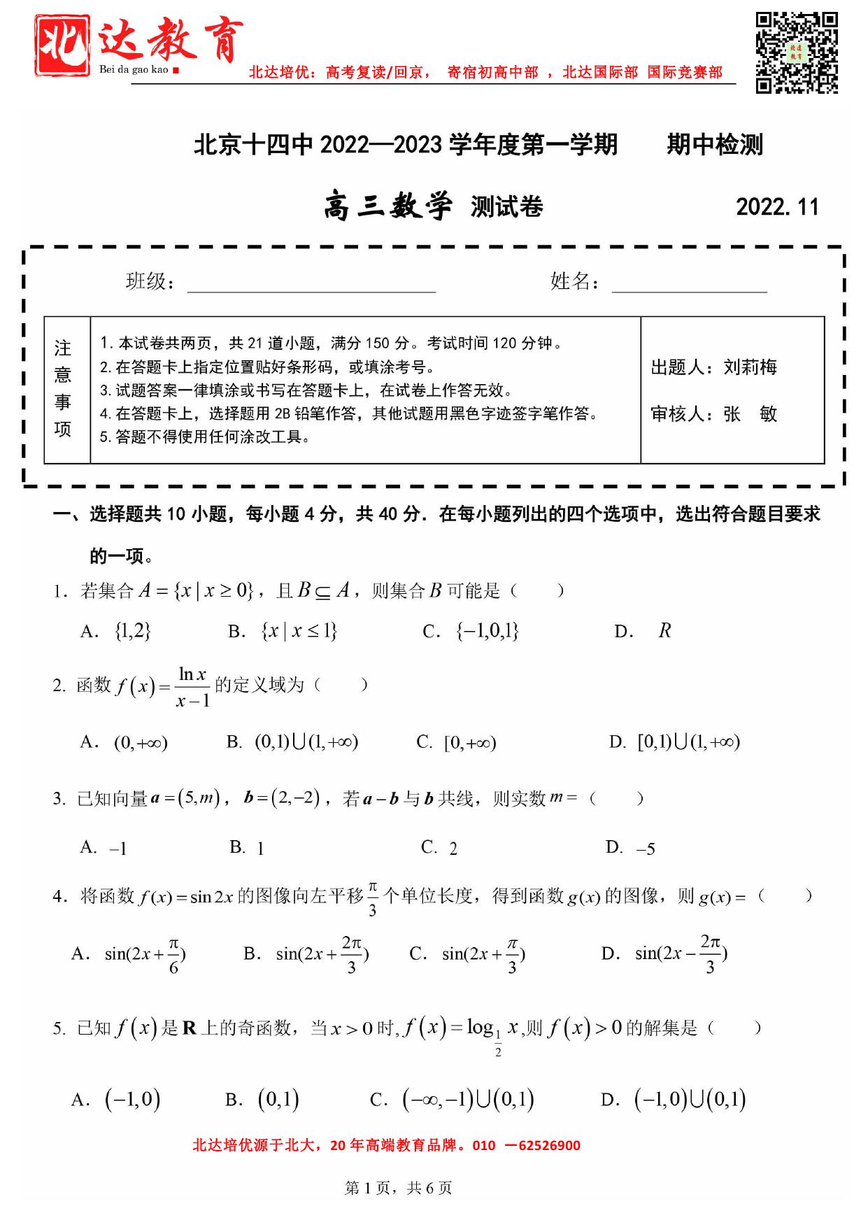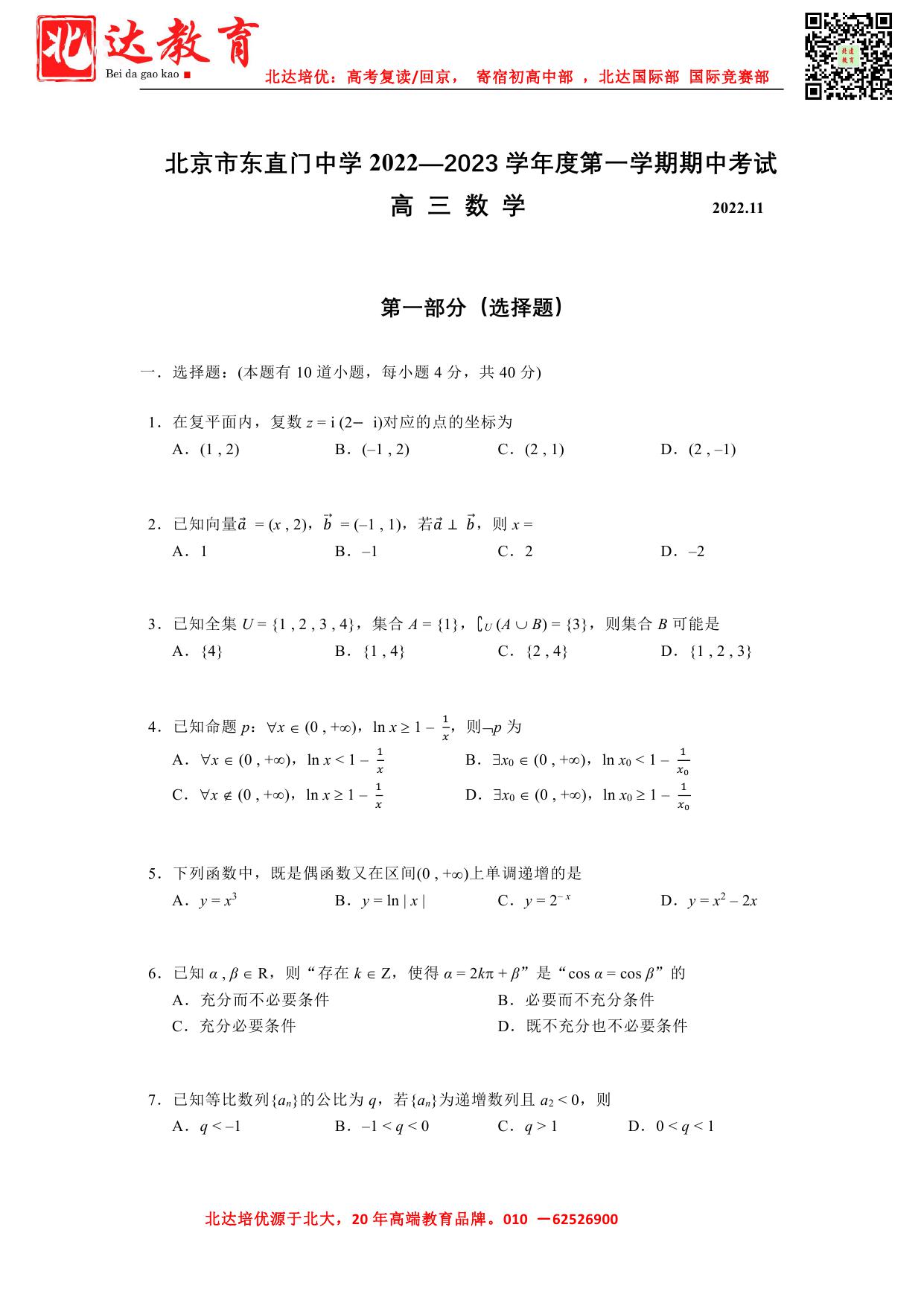 北京市2022-2023学年高三期中试题及答案汇总
