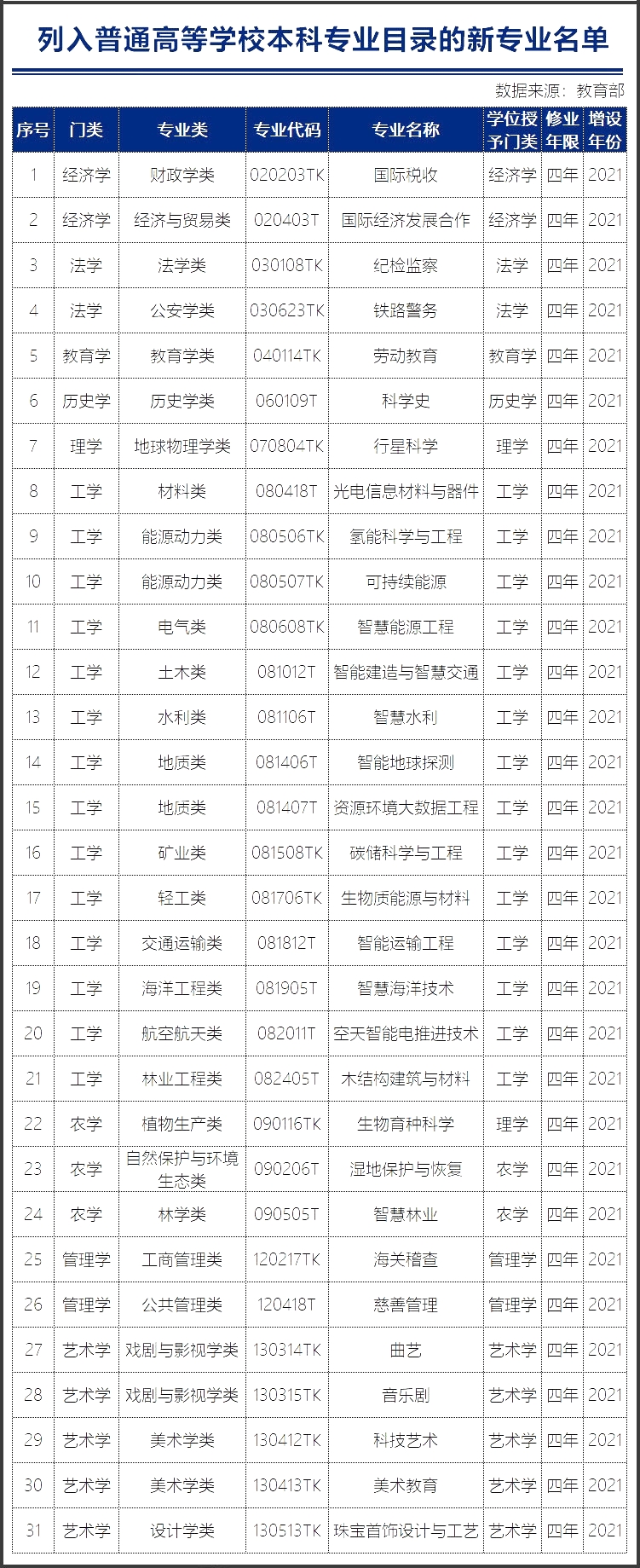 根据高等学校专业设置与教学指导委员会评议结果,确定了同意设置的国家控制布点专业和尚未列入专业目录的新专业名单,碳储科学与工程、空天智能电推进技术、行星科学、光电信息材料与器件、氢能科学与工程、可持续能源等31个新专业列入普通高等学校本科专业目录。