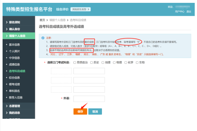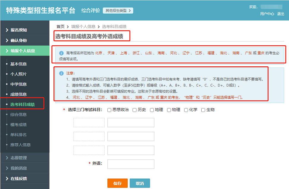 其次,要填写高考外语和三门选考科目的最好成绩,三门选考科目中如果有没考或者是缺考的话就填写“0”,不是考生本人的选考科目的不要填写。