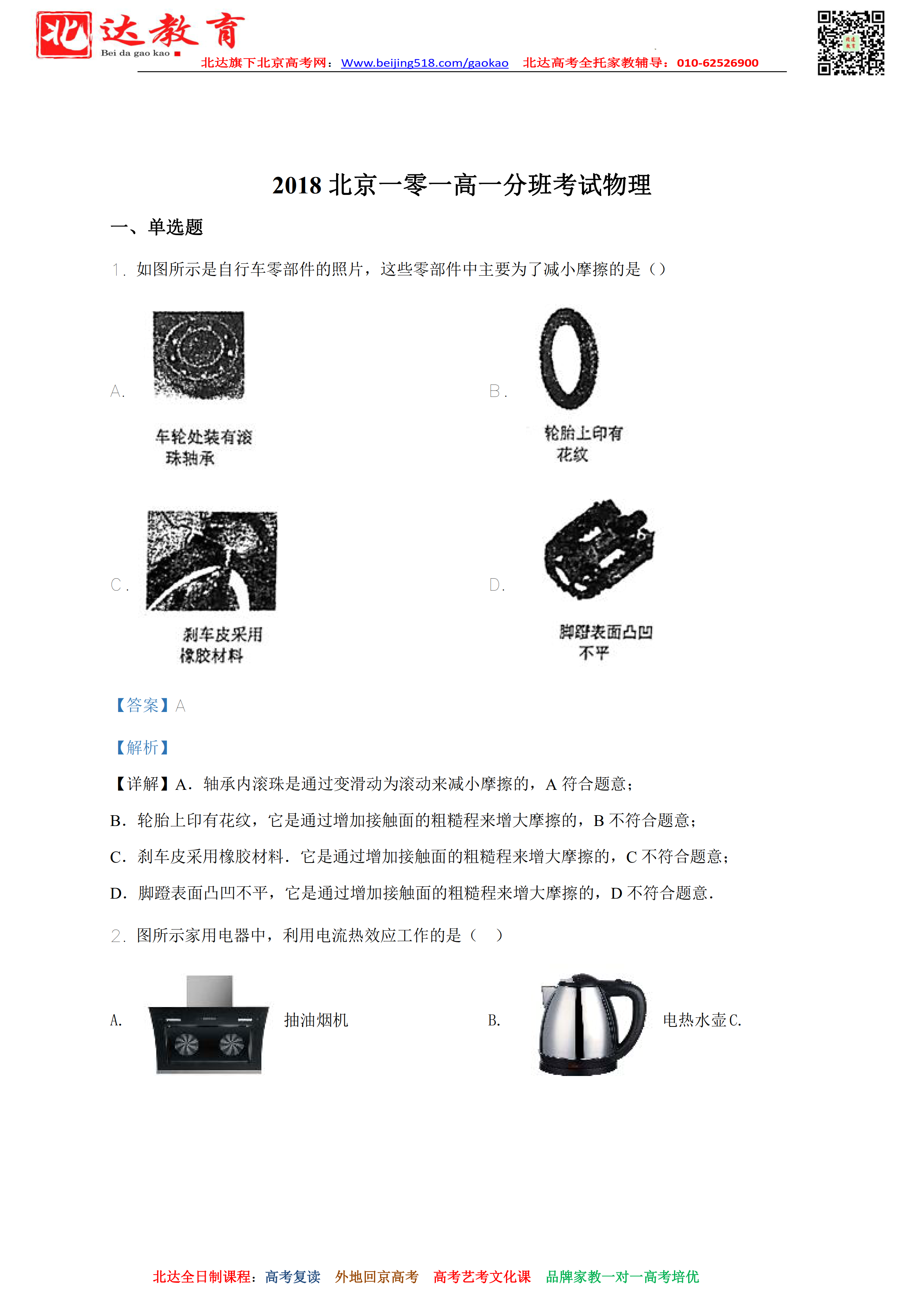 北京101中学新高一分班考物理真题3