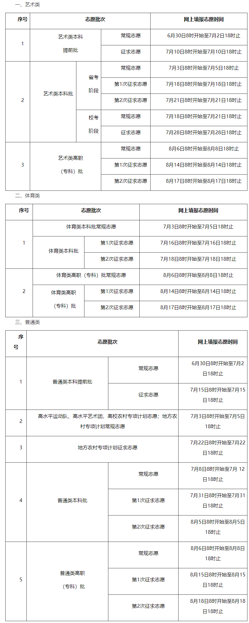 各类各批次征集志愿填报时间