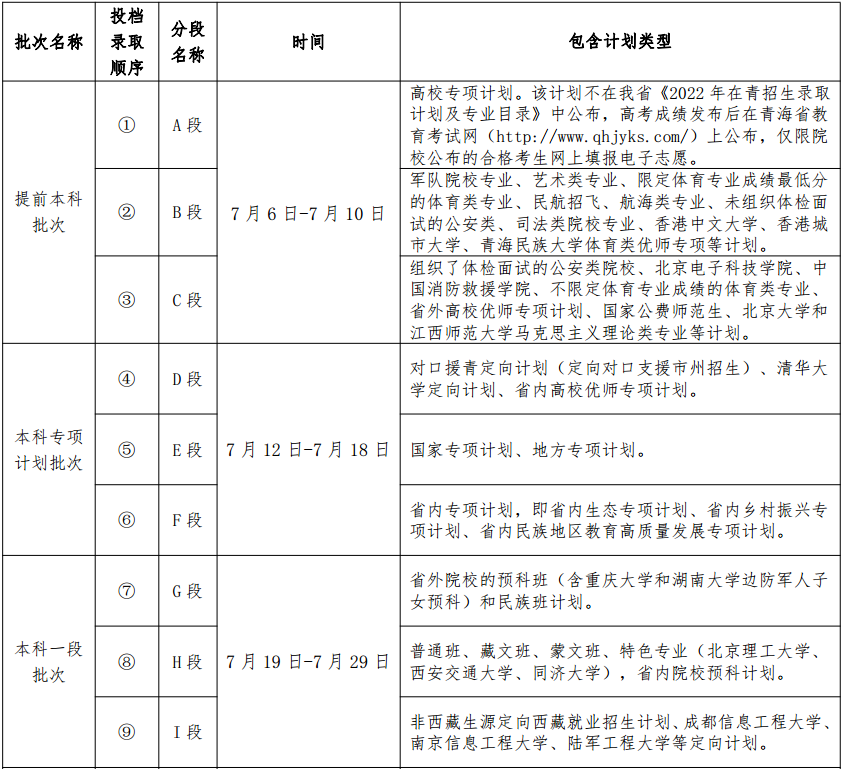 注:以上各批次投档录取时间仅供考生参考。省考试院将于每一批次投档录取开始前,在青海省教育考试网和青海省教育招生考试(微信公众号)发布该批次录取进度安排及相关事宜。