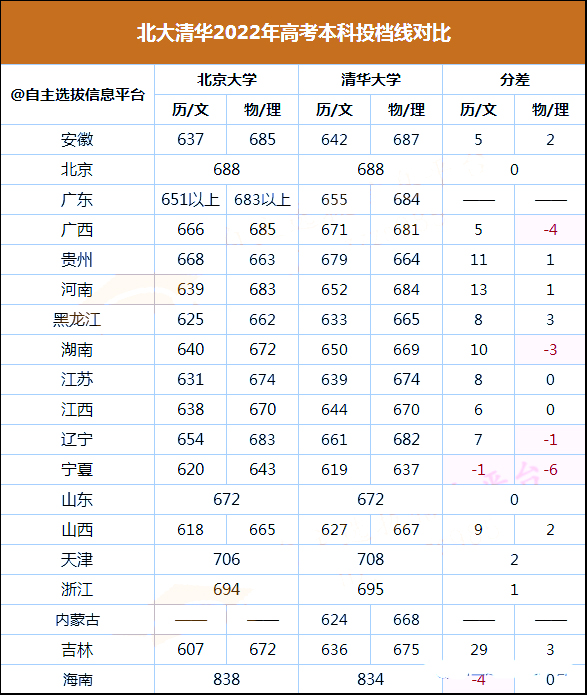 从上表可以看出,在已公布结果的19个地区中,除了内蒙古和广东因无法知晓北大具体投档线无法对比外。在其他17个地区中:文科类:北大比清华分高只有2个地区,而清华比北大高的有11个地区,平均高7-8分,吉林甚至高达29分,很明显,北大在吉林报空,断档了,不知道没报的考生有没有悔的肠子都青了。