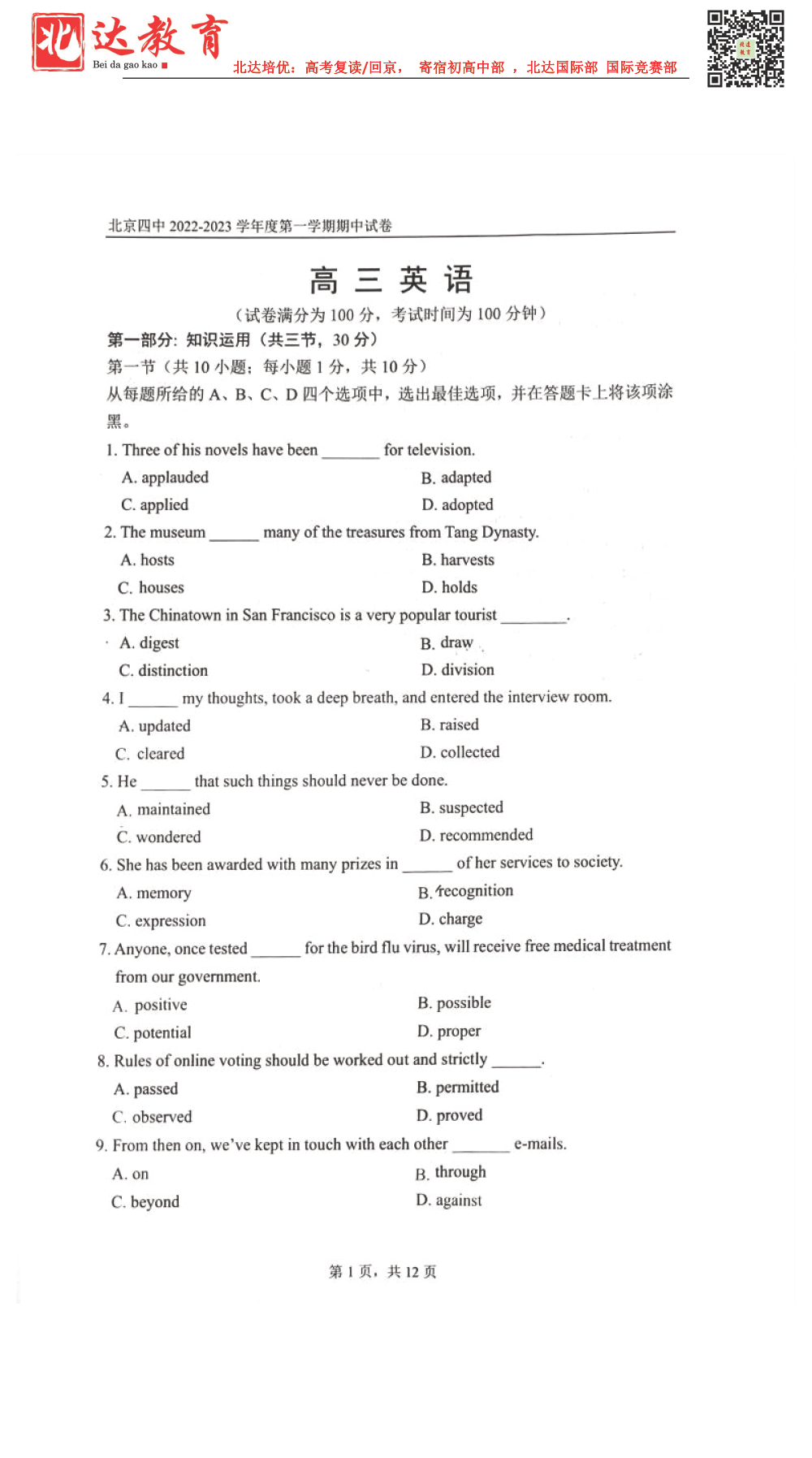相关链接:北京市2022-2023学年高二第一学期期中试题及答案汇总