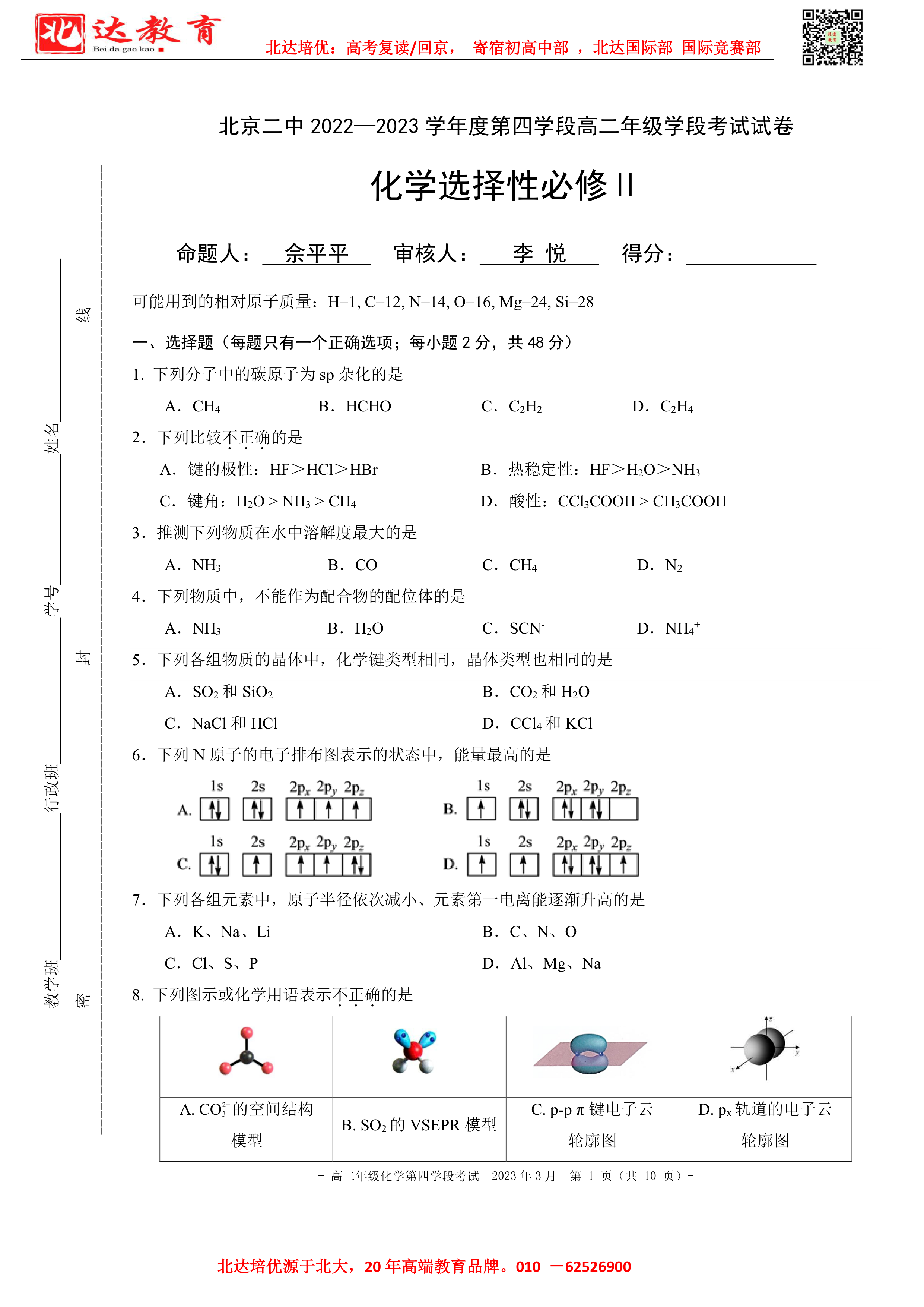 2023北京北师大实验中学高二3月月考化学试题及答案