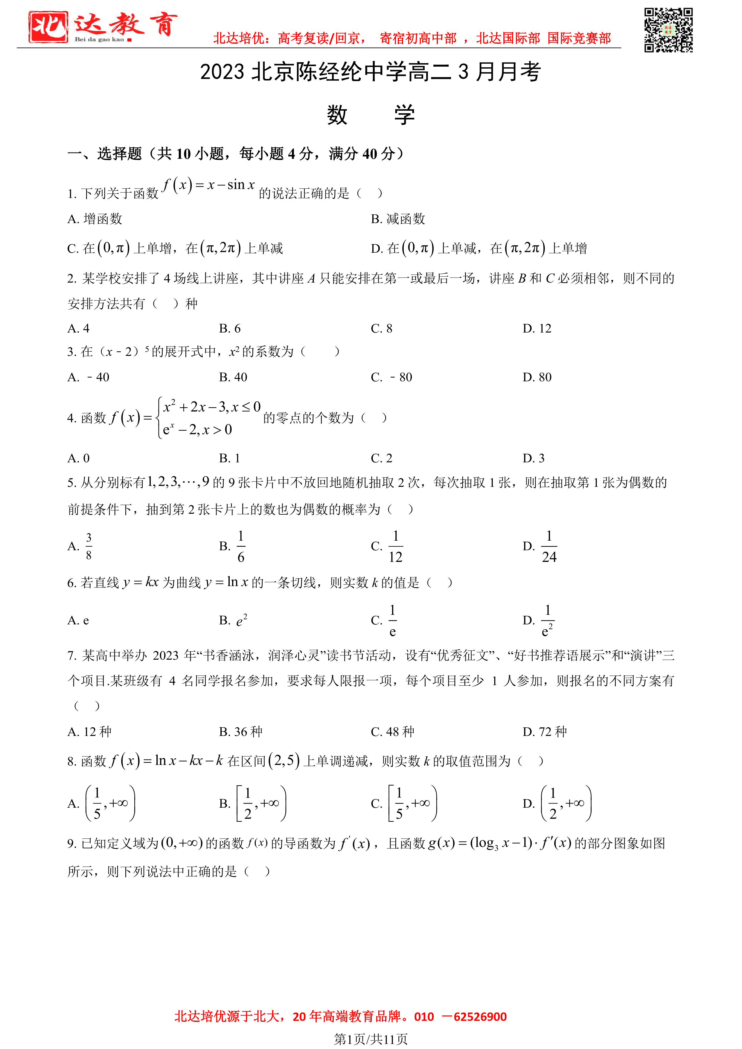 2023北京陈经纶中学高二3月月考数学试题及答案