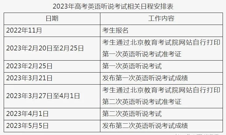 北京市高考英语听说考试采用计算机考试模式,实行一年两考。2023年高考第一次英语听说考试于2023年2月25日进行,第二次英语听说考试于2023年4月1日进行。