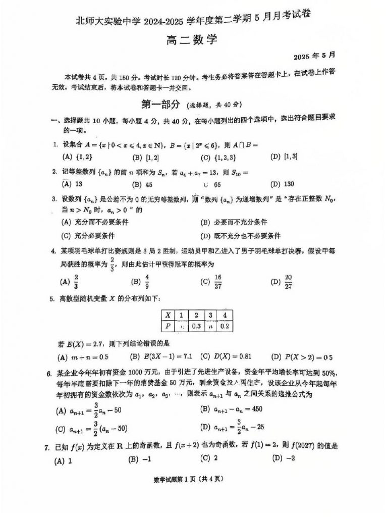 2025北京北师大实验中学高二5月月考数学试题