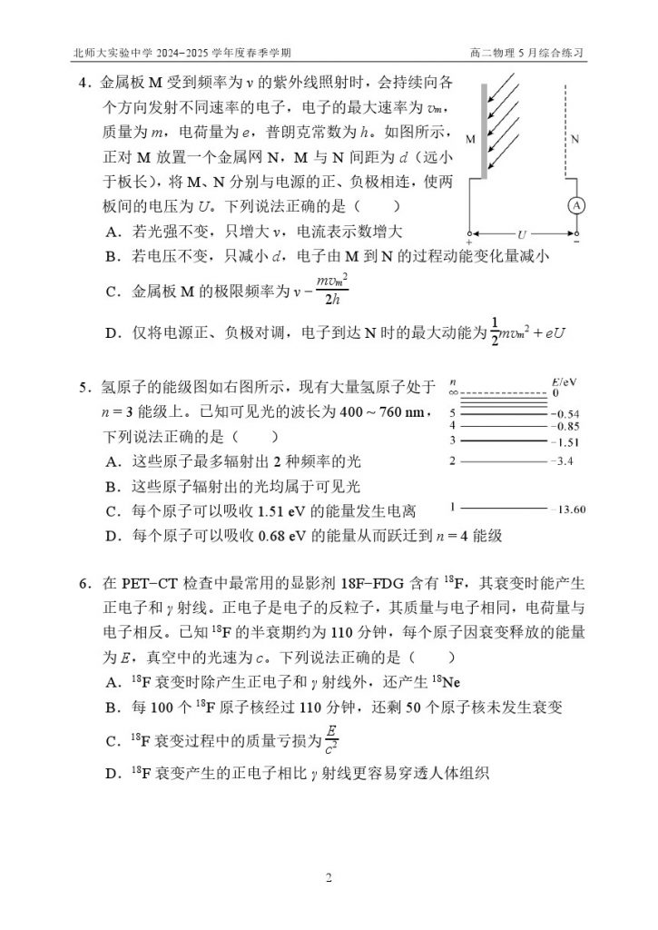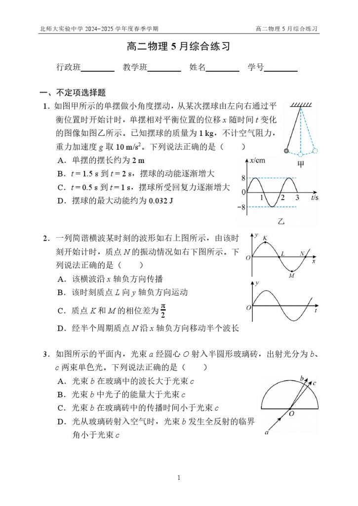 2025北京北师大实验中学高二5月月考物理试题及答案