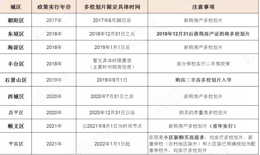 根据2021年幼升小政策要求,除平谷区还有八个城区明确提出购房时限要求,限定日前后购房不享受单校划片,通过多校划片方式入学。相关内容整理如下(根据相关政策整理,仅供参考,2022入学政策须以各区官方正式发布为准):