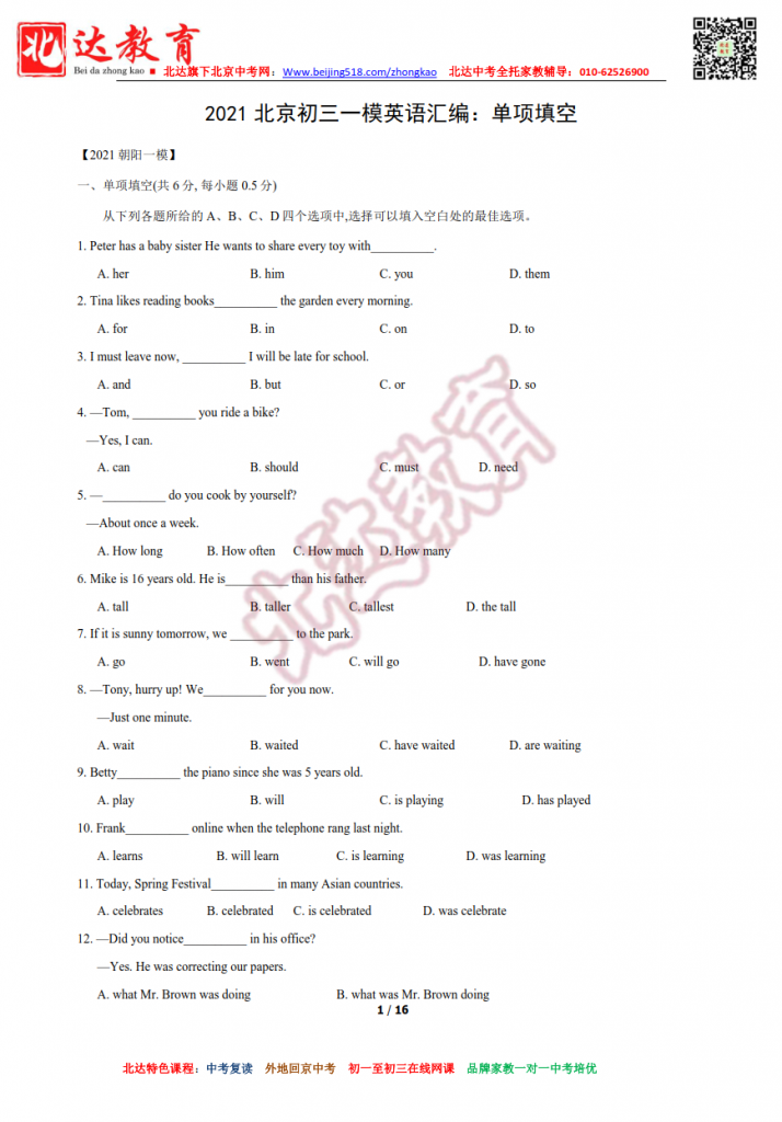 北京各区2021初三一模英语汇编:单项填空(含答案)。admw360中考复读学校教研组收集整理,分享给大家。
