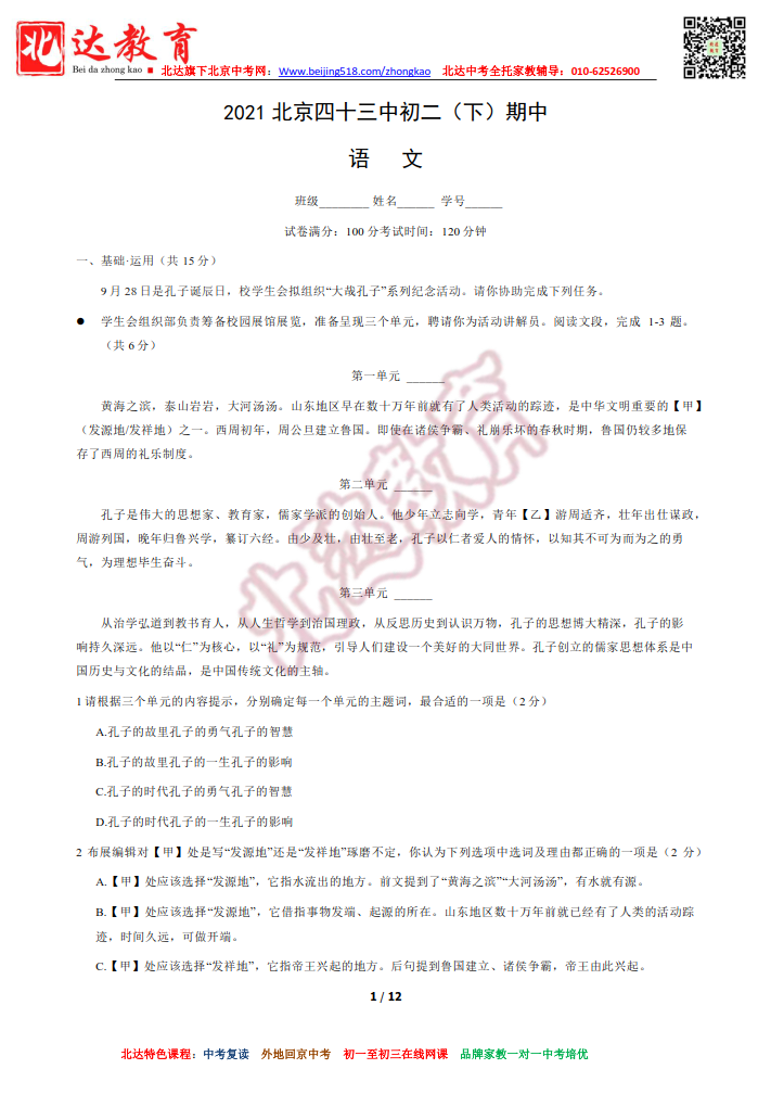 北京四十三中2021初二下期中语文试题及答案。admw360中考复读学校教研组收集整理,分享给大家。