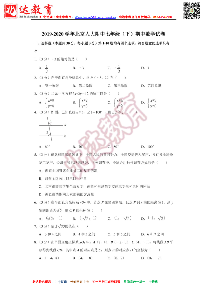 人大附中2020初一下期中数学试卷(附答案)。admw360中考复读学校教研组收集整理,分享给大家。