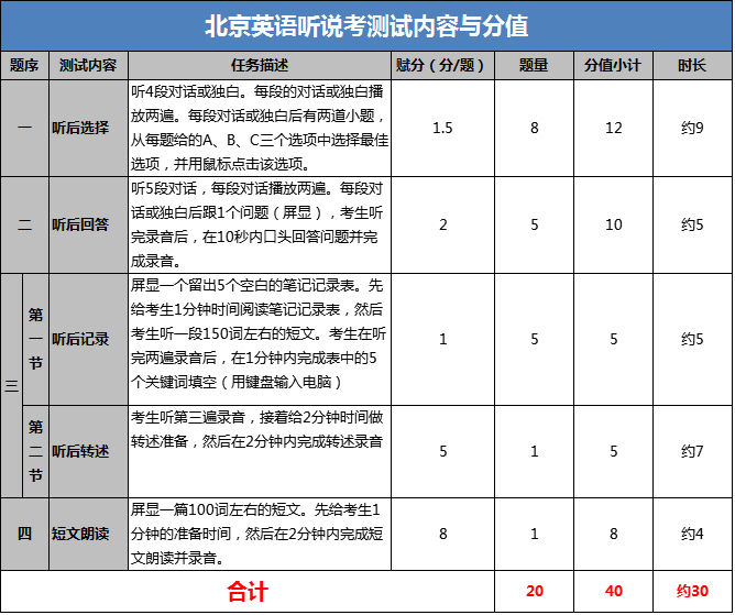 中考英语听说考总分40分,考试时长为30分钟,因此大家在考前需要特别注意的一点就是加强自己对考试时间的把握,提高自己的时间节奏感。