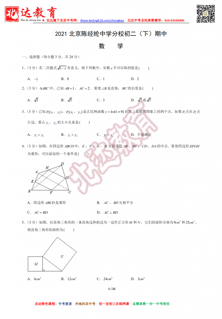 北京陈经纶中学分校2021初二下期中数学及答案。admw360中考复读学校教研组收集整理,分享给大家。