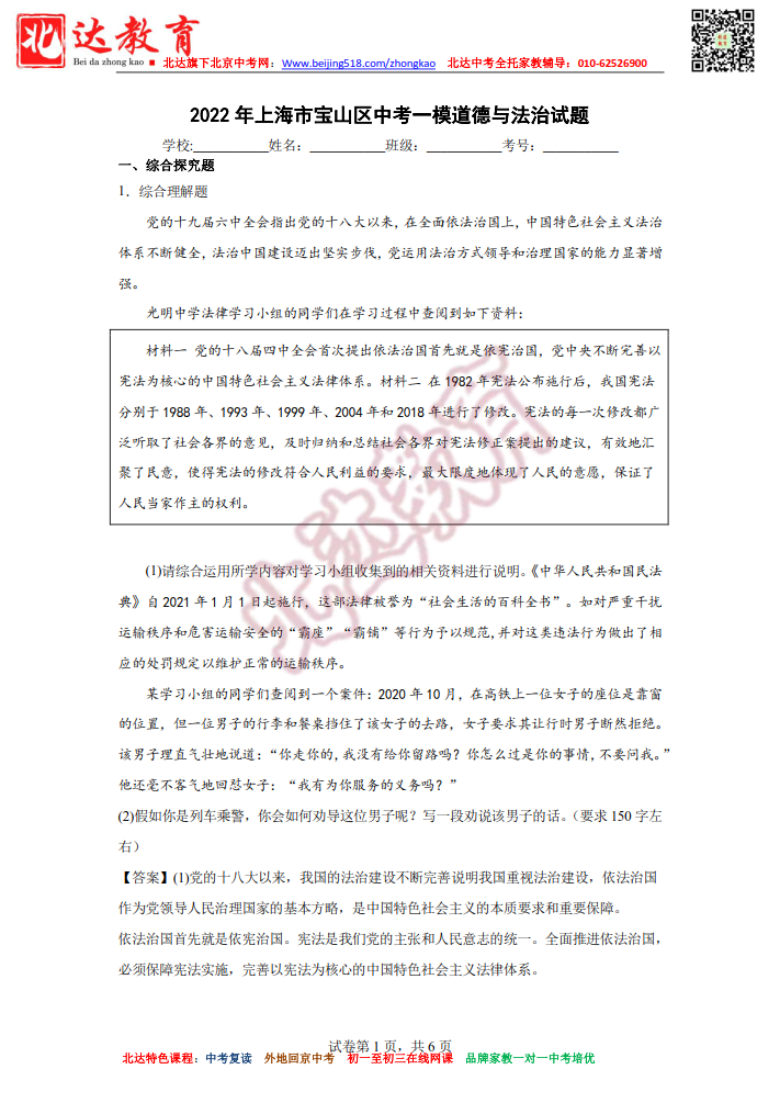 2022上海各区中考一模道法试卷及答案合集。admw360中考复读学校教研组收集整理,分享给大家。
