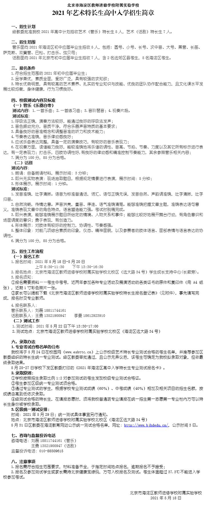 2022年海淀进附属实验学校特长生招生要求有哪些?海淀进附属实验学校特长生的招收条件和报考资格都有什么要求?admw360教研组整理了相关信息,分享给大家。