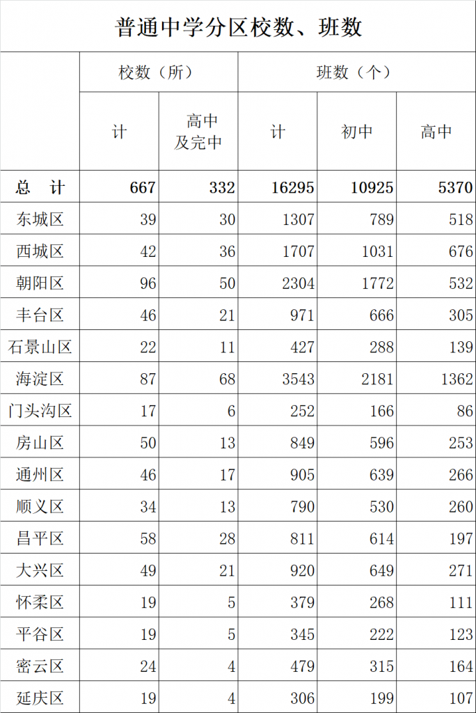 3月25日,北京市教委公布了《2021-2022学年度北京教育事业发展统计概况》。公布了北京各区中学学校数量及班级数量,朝阳区以96所中学位列第一,海淀87所位居第二,但班级数量最多的还是海淀区,初中2181个班,高中1362个班。