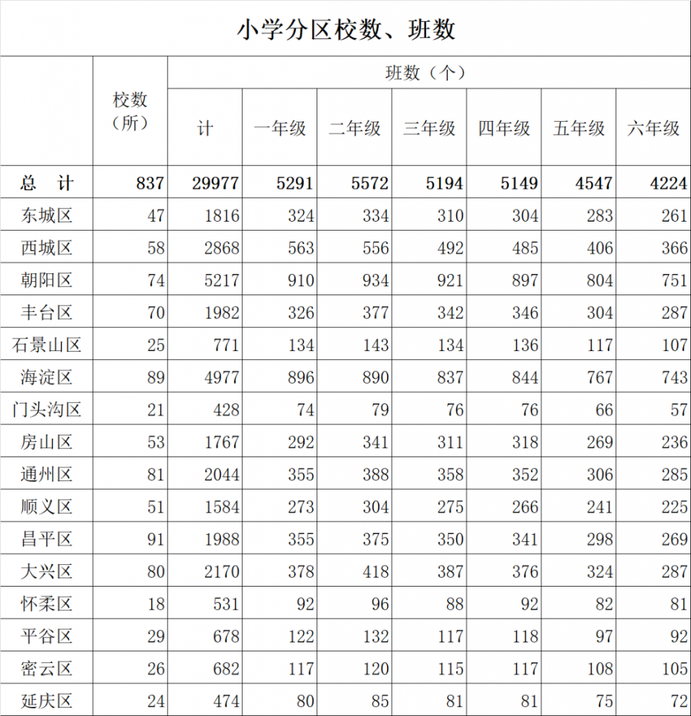 统计显示,海淀这2.6万名六年级学生分别就读于海淀区89所小学的743个毕业班当中,值得注意的是学校数量最多的并不是海淀区,而是昌平区的91所;班级数量最多的则是朝阳区的751个。