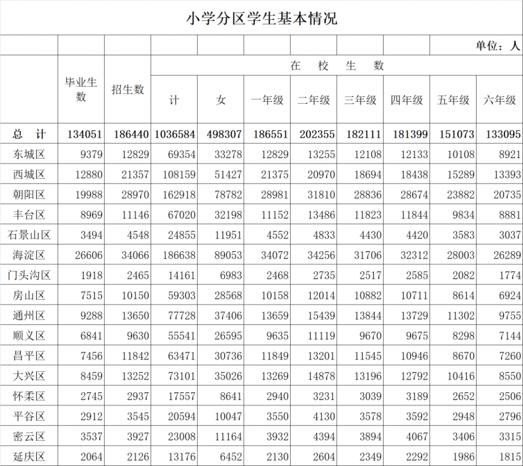 据统计,2021-2022学年六年级在读学生总计133095人,也就意味这北京市今年将有13.3万小学生升入初中,其中,海淀区六年级在校学生人数为26289人,今年海淀区会有约2.6万人步入小升初的升学队伍中,具体各区小学学生基本情况如下: