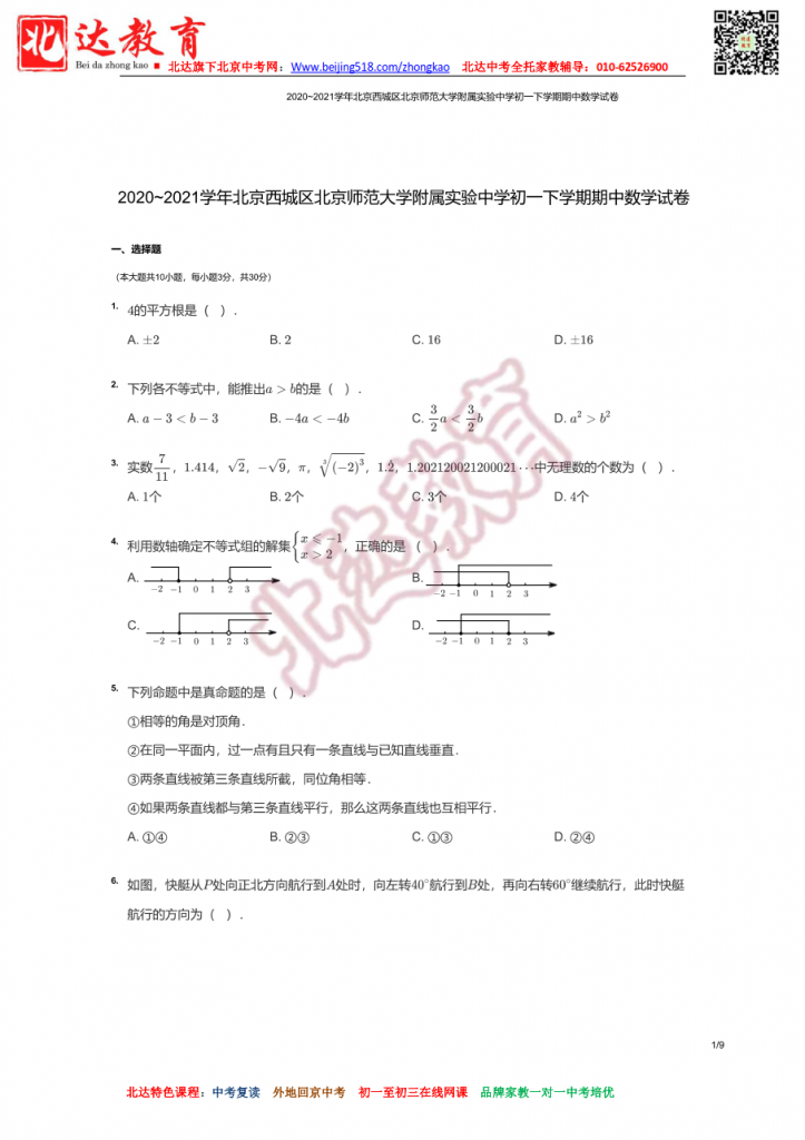 北师大附属实验2021初一下期中数学试卷及详解。admw360中考复读学校教研组收集整理,分享给大家。