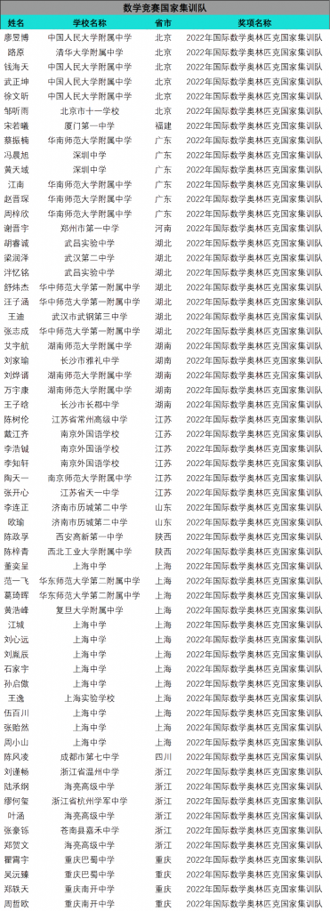 2022年国际数学奥林匹克国家集训队名单(按省份排序)