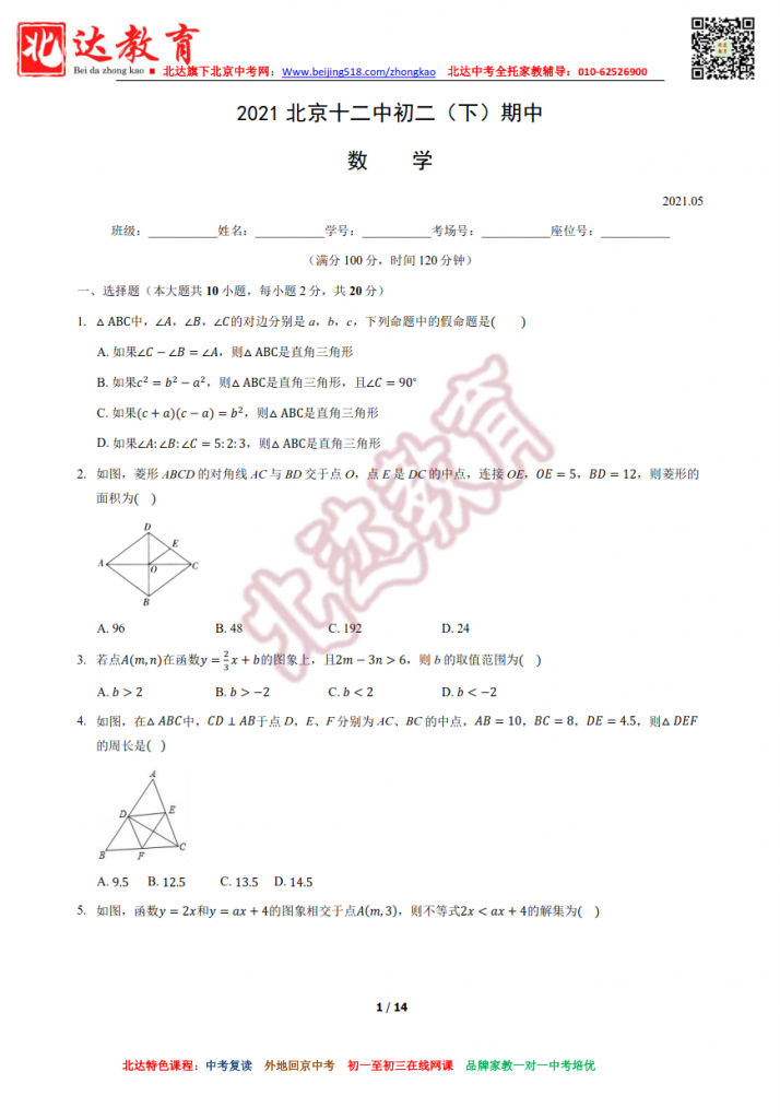 北京十二中2021初二下期中数学试题及答案。admw360中考复读学校教研组收集整理,分享给大家。