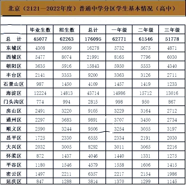 3、据上述数据知,现阶段高三在校生数为51778人,高二在校生数为61546人,高一在校生数为62771人。随着高中在校生数攀升,北京高考生人数已从近年的波谷逐年回升(2021年应该是近10年来人数最少的一年),而且这一上涨趋势将在未来相当一段时间保持稳定。所以,对于北京高考生来说,未来竞争压力预计更为激烈。值得注意的是,北京各区都有学位增加,保障学生们入学基本是没问题的。